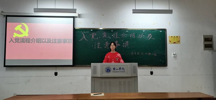 我校党委组织部老师杨涛带领大家学习《中共我校委员会发展党员工作实施细则》、《推荐优秀团员为入党积极分子工作实施细则》等文件,并介绍大学生入党流程及注意事项,现场解答了同学们提出的关于入党方面的问题。