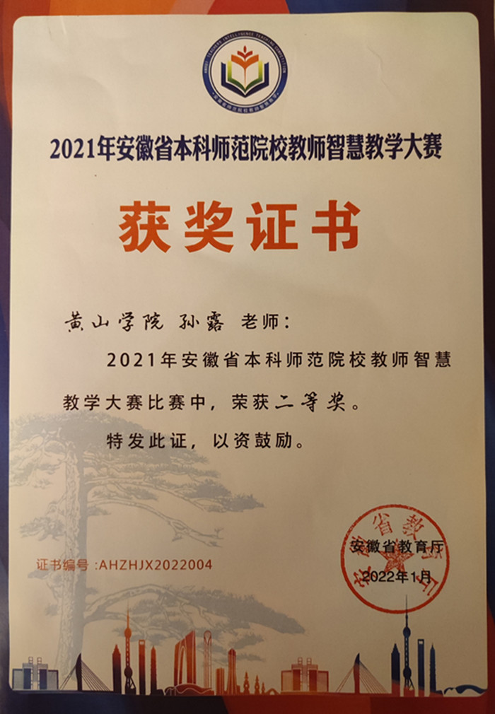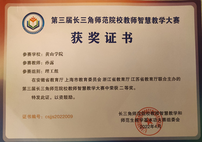 近日,第三届安徽省师范院校教师智慧教学大赛和长三角师范院校教师智慧教学大赛比赛结果先后公布,经过激烈角逐,我校best365在线官网登录入口教师孙露分别荣获该项大赛省赛和决赛理科组二等奖,是我校该项教学比赛中取得最好成绩。