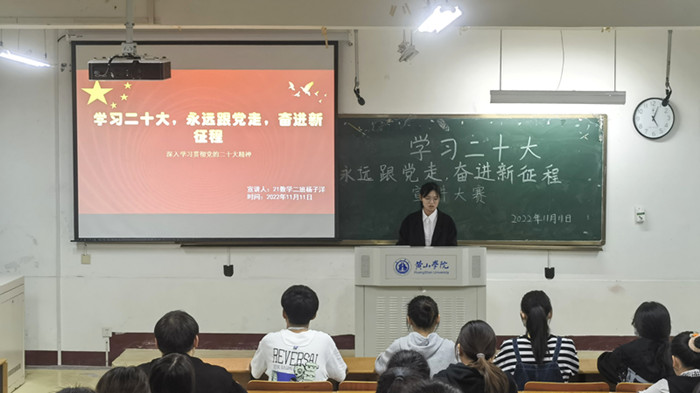 为把广大青年的思想和行动统一到党的二十大精神上来,号召同学们坚定理想信念,紧跟党的步伐,best365在线官网登录入口团委于11月下旬在横江校区教学楼1401教室举办了“学习二十大,永远跟党走,奋进新征程”党的二十大精神宣讲大赛。