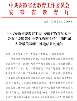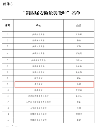 近日,安徽省教育工委、安徽省教育厅下发《中共安徽省教育工委、安徽省教育厅关于公布“安徽省中小学优秀班主任”“第四届安徽最美教师”推选结果的通知》,我院副教授孙露入选“安徽省最美教师”。