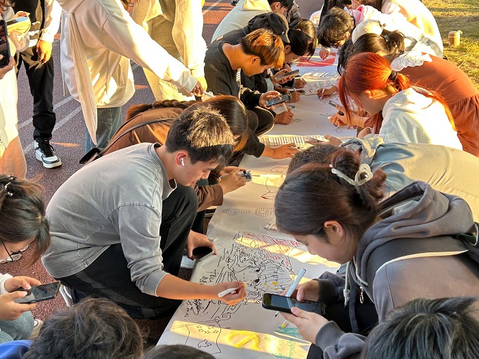 几盒画笔,数米画卷,一场画笔与色彩的碰撞就此开始。参加活动的同学以“热爱党、热爱祖国、奉献青春”为主题,充分发挥想象力与创造力,在画布上你画一笔,我添一色精心绘制图案,将自己对祖国的热爱充分表达。同学们或席地而坐、或匍匐弯腰、或扑在画布上上色。经过一个小时的创作,五彩斑斓的画卷展现在眼前。作品灵动秀美,凝聚了同学们对祖国的礼赞与祝福。