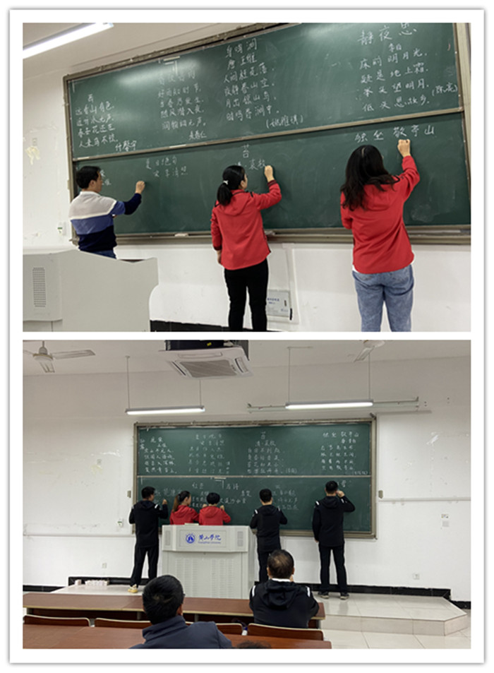 我院四十周岁以下教师共13人参加本次比赛,比赛以书写五言绝句并现场朗诵的形式进行。老师们依次在黑板上写上五言绝句并声情并茂的朗诵书写内容, 一幅幅作品展现在眼前,笔画清楚,字形规范,行款格式正确,板面整洁,有的刚劲有力、有的潇洒飘逸、有的大方得体、有的秀气隽美……各位参赛教师纷纷拿出看家本领,一笔一划透出了认真的态度。