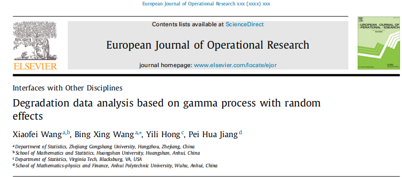 近期,我校best365在线官网登录入口青年教师王小飞博士为第一作者的论文《Degradation Data Analysis Based on Gamma Process With Random Effects》在工业统计领域顶级期刊European Journal of Operational Research(EJOR)上正式发表。该论文以具有随机效应的伽马退化模型为研究对象,采用广义p值法来检验不同产品退化路径之间是否存在异质性,借助Cornish-Fisher展开式等办法得到了感兴趣可靠性指标的置信区间。论文中的方法在小子样下也具有良好的性能,较好的解决了可靠性研究中小样本要求和高精度需求之间的矛盾。
