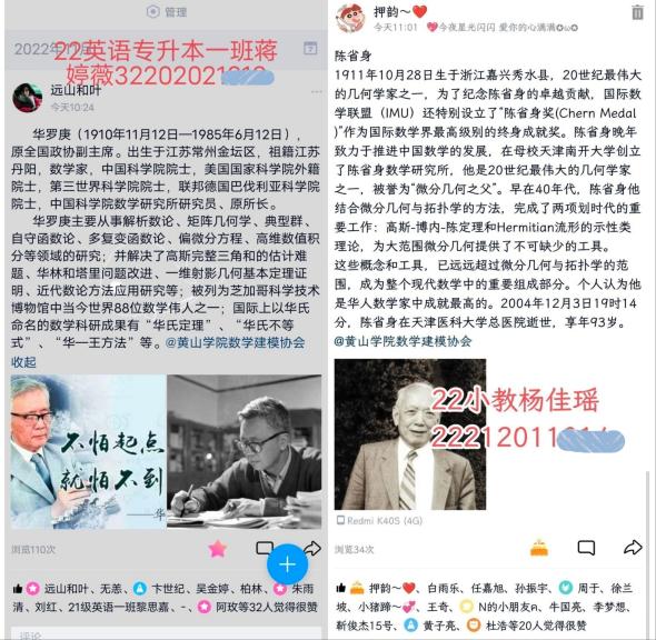 活动伊始,会长林嘉欣就将该次名人故事分享活动发布到梦空间并通知到数学建模协会群。同学们踊跃报名,主动积极发布关于古今中外数学家们的故事动态,分享给朋友们点赞,最后将活动截图上传至群相册。经过为期四天的线上交流,共有600名同学参加完成了本次活动,分享了许多名人故事,比如有刻苦钻研、不断创新的祖冲之,有好学聪明、思维独特的华罗庚,还有见解独特、意志坚定的陈省身等等。让学生们沉浸在一个个生动有趣又励志的数学名人故事里,与“趣味学习数学”理念相契合,营造了良好的学习数学的氛围。