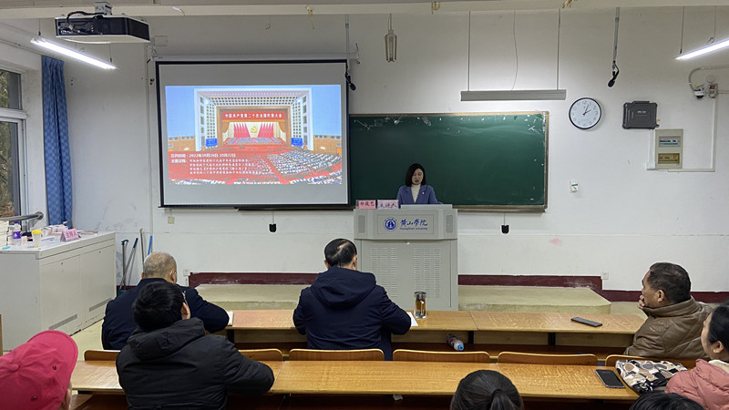 开班仪式后,全体培训班学员按照培训工作安排,现场聆听了校学习宣传贯彻党的二十大精神宣讲团成员、马克思主义学院郑俊艺老师作题为“深入学习贯彻党的二十大精神”宣讲报告会。报告深刻阐明了领会党的二十大的重大政治意义、理论意义、现实意义和历史意义,从多个角度、多个层面科学分析了如何准确地把握党的二十大精神实质,最后从理论和实践的高度,结合学校实际,倡导与会同志要更加紧密地团结在以习近平同志为核心的党中央周围,把思想和行动统一到党的二十大精神上来,把智慧和力量凝聚到落实党的二十大提出的各项任务上来,坚定信心、同心同德,埋头苦干、砥砺前行,在以中国式现代化全面推进中华民族伟大复兴过程中展现我校作为、贡献我校力量!报告会受到数统学院师生的一致好评。