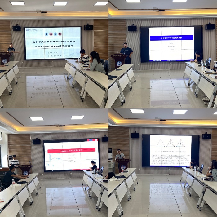 报告会上,韩爽博士分享题为《五阶WENO-Z格式的研究与应用》的报告,主要介绍五阶 WENO-Z 格式在求解双曲守恒律方程中的一些研究进展及其应用。陈帅余博士主要探究在所有可能出现的分布下能使预测和检验保持稳定的权衡策略,分享了题为《分布变动下的权衡策略研究》报告,鲍琪博士以《q-Laguerre 多项式的算子表示》为题,介绍了正交多项式在物理学中的广泛应用。李兴博士通过分析随机型伪分形网络模型,研究复杂网络模型的极限度分布。