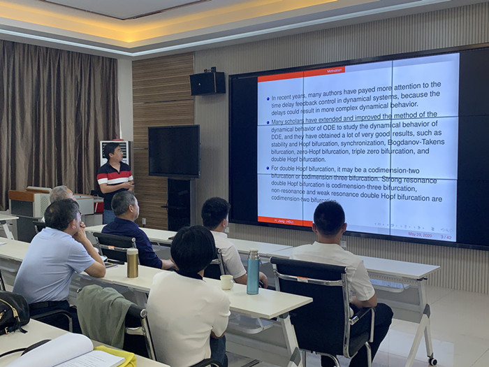 5月27日,我院蒋和平老师在横江校区图书馆附楼301举办题为《时滞微分系统中弱共振与非共振双Hopf分支问题》报告会,报告会由院长汪宏健主持。