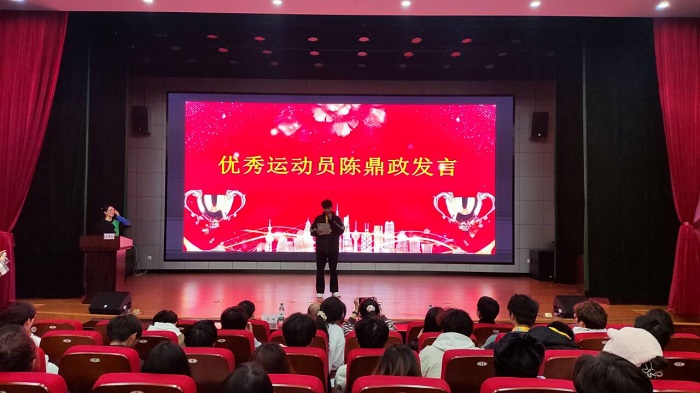 随后,优秀运动员代表陈鼎政上台发言,他表示,优异的成绩离不开平日里刻苦的训练,希望大家把运动会中收获的信心和感动,凝聚成攻坚克难、砥砺前行的青春正能量,点燃拼搏之火,照亮梦想之光。最后,校园优秀歌手武振扬和桂煦之合唱歌曲《下一个天堂》,在他们婉转动听的歌声中,表彰大会圆满结束。